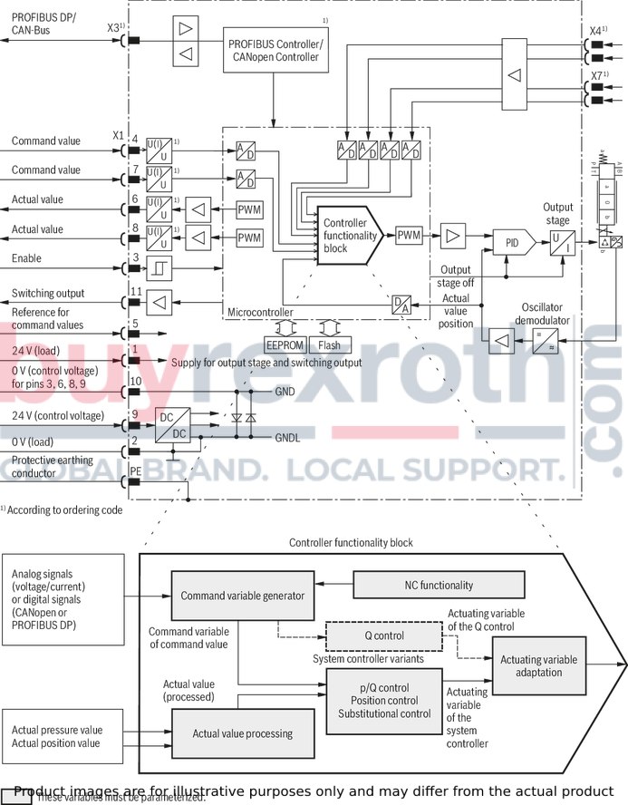The IACR valve allows command value presetting to be specified either via analog interface or through a field bus interface. Actual value signals are provided through an analog interface and can also be accessed via the field bus. The controller parameters are effortlessly set using the field bus connection, while maintaining separate supply voltage for the bus/controller and power part output stage for enhanced safety.