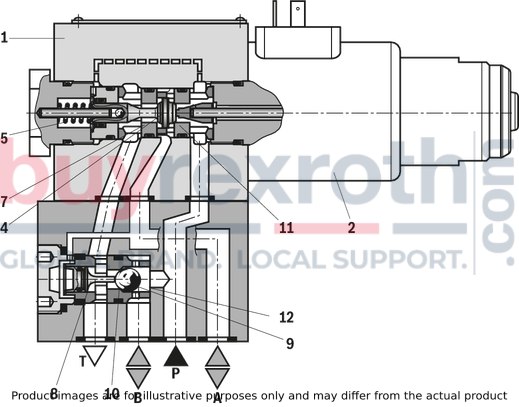 In the initial position, the control spool (4) is pressed onto the seat (11) by the spring (5), in spool position, it is pressed onto the seat (7) by the solenoid (2). The flow is blocked.