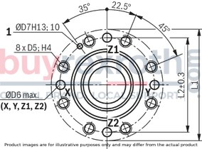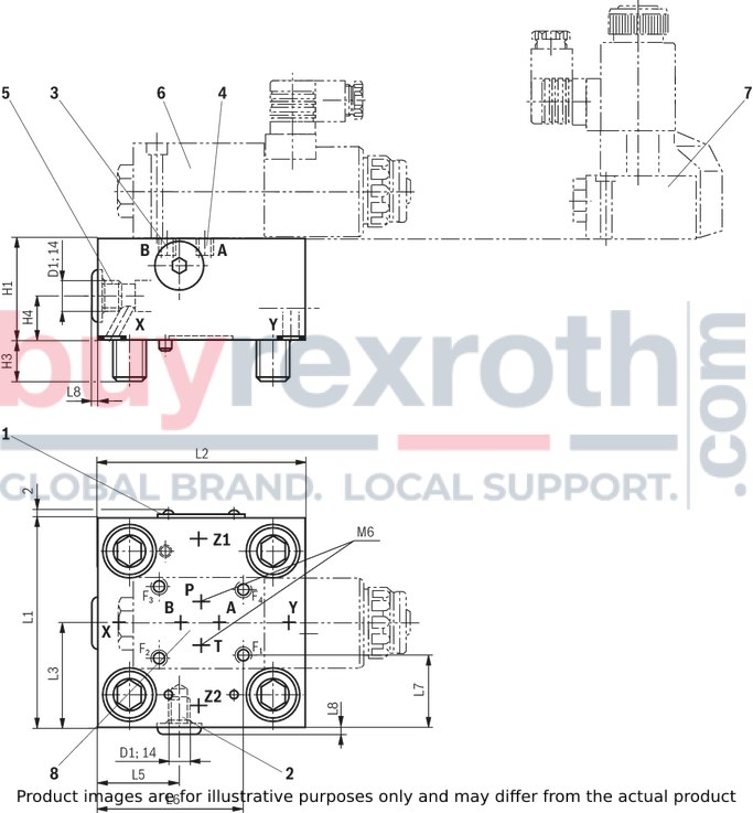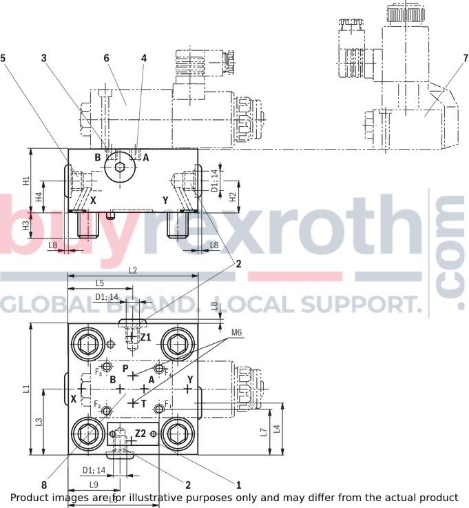 | 1) | Due to the use of a bore with ØD3*, port B protrudes over the upper limit of the area intended in ISO 7368. This is, however, possible due to the sealing concept and reduces the pressure loss during flow through the valve. Thus, we recommend a bore with ØD3*. |
