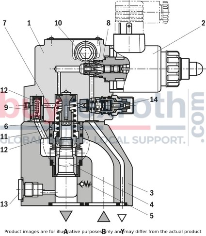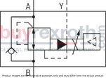 This model includes an optional check valve between ports A and B and offers an optional spring-loaded pressure relief valve for maximum pressure limitation. The device guarantees safety against excessive pressures due to high electric control current at the proportional solenoid. Additionally, it has a pressure gauge connection for monitoring reduced pressure in channel A.