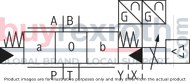 Positive command value (0 ... 10 V or 12 ... 20 mA) at D and reference potential at E cause flow from P → A and B → T. Negative command value (0 ... -10 V or 12 ... 4 mA) at D and reference potential at E cause flow from P → B and A → T.