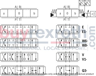 Symbol V and V1-:Pilot-operated 4/3 directional control valves are only functional in the active control loop and do not have a locking basic position when deactivated. Consequently "external isolator valves" are required in many applications and must be taken into account regarding the switch-on/switch-off order.