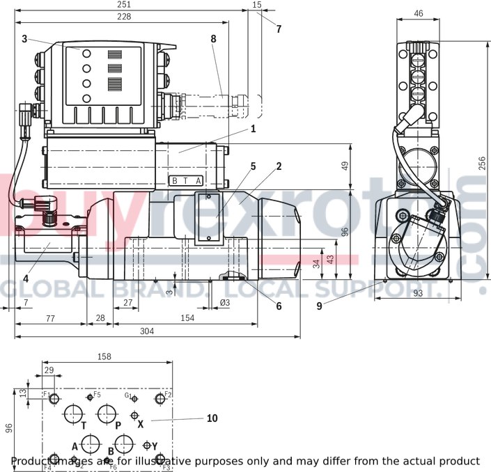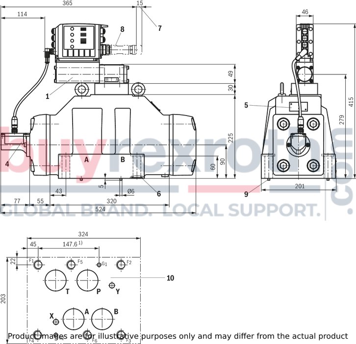 With this version, the pilot oil is supplied from channel P of the main valve (internally). The pilot oil return is not directed into channel T of the main valve, but is separately directed to the tank via port Y (external). In the subplate, port X is to be closed.