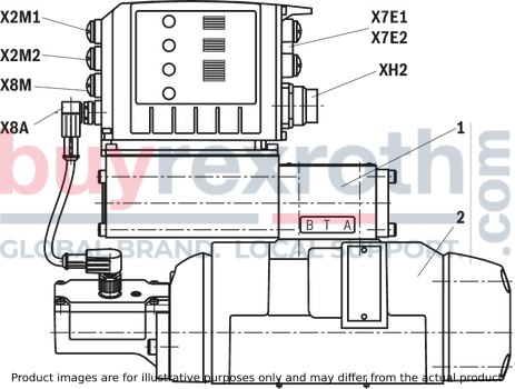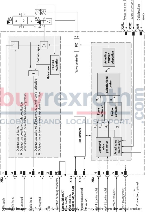 Pilot control valve (1) with control spool and sleeve in servo quality Main stage (2) with centering springs and position feedback Integrated digital axis controller (3) with: analog/digital interface (XH2) Ethernet interfaces (X7E1, X7E2) analog sensor interfaces (X2M1, X2M2) digital sensor interface (X8M) Interface for the position transducer of the main stage (X8A)