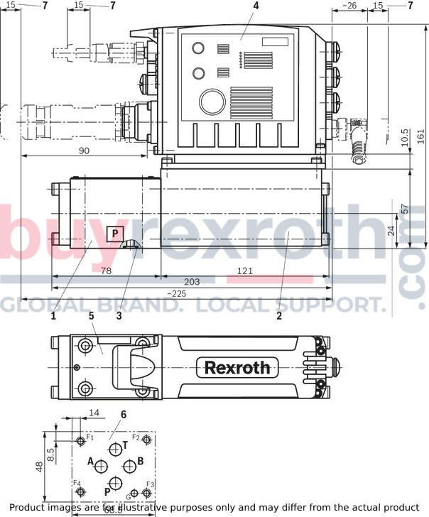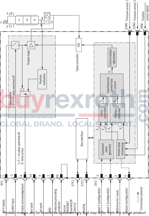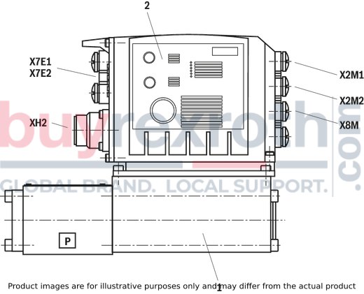 Direct operated directional control valve (1) with control spool and sleeve in servo quality Integrated digital axis controller (2) with: analog/digital interface (XH2) Ethernet interfaces (X7E1, X7E2) analog sensor interfaces (X2M1, X2M2) digital sensor interface (X8M)Directional control valve with integrated axis controller, analog interfaces (X2M1, X2M2), digital interfaces (XH2, X8M) and Ethernet interfaces (X7E1, X7E2)