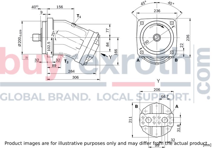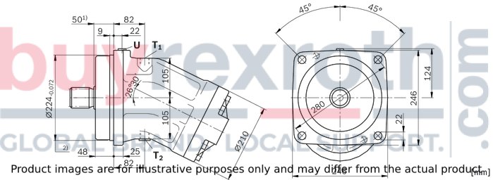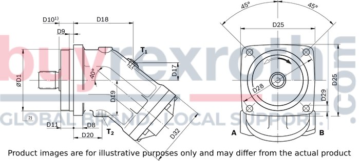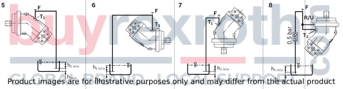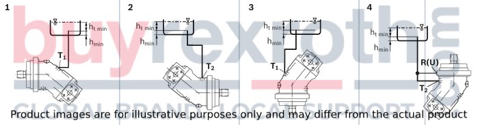 During commissioning and during operation, the axial piston unit must be filled with hydraulic fluid and bled. This must also be observed during longer standstill as the axial piston unit might drain itself via the hydraulic lines. Complete filling and bleeding must especially be ensured with the “Drive shaft upwards” installation position as there is, for example, the risk of running dry. The leakage in the housing area must be discharged to the tank via the highest-located drain port (T1, T2). If one joint drain line is used for several units, it is to be ensured that the relevant housing pressure is not exceeded. The joint drain line must be dimensioned so that the maximum admissible housing pressure of all connected units is not exceeded in any operating state, particularly during cold start. If this is not possible, separate drain lines have to be laid, if necessary. In order to achieve favorable noise values, all connection lines are to be decoupled using elastic elements and over-tank installation is to be avoided. The tank line must lead into the tank below the minimum liquid level in every operating state.Installation position