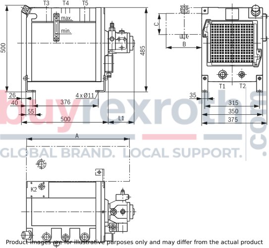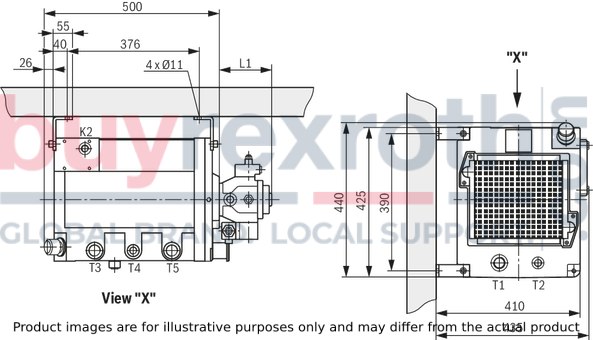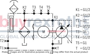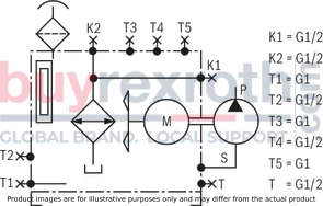 The Bosch Rexroth UPE5-1X/400V7/20-25AN-H-1+04100643 (R904100644) is a highly efficient and compact drive module designed for hydraulic systems. This unit integrates an electric motor with a hydraulic pump, eliminating the need for coupling by directly plugging the pump shaft into the electric motor's hollow drilled shaft end. This design significantly reduces the overall length of the pump-motor group, making it ideal for applications where space is at a premium. The module operates by drawing in hydraulic fluid from a tank through a suction tube, delivering it to the hydraulic control, and then returning it via connections K and K through an oil-air cooler. The axial fan wheel attached to the electric motor ensures both the hydraulic fluid and motor remain cool during operation.