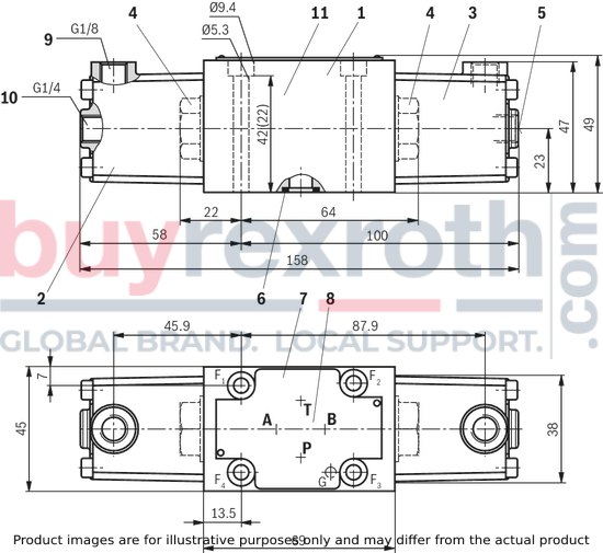 Porting pattern according toISO 4401-03-02-0-05 (with locating hole for locking pin ISO 8752-3x8-St, material no. R900005694, separate order) |