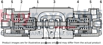 When de-energized, the control spool (3) is held in the central position or in the initial position by the return springs (4) (except impulse spool).