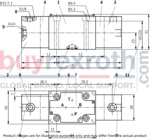 Porting pattern according toISO 4401-03-02-0-05 (with locating hole for locking pin ISO 8752-3x8-St, material no. R900005694, separate order) |