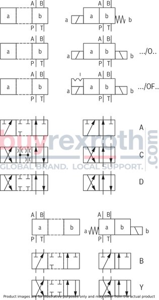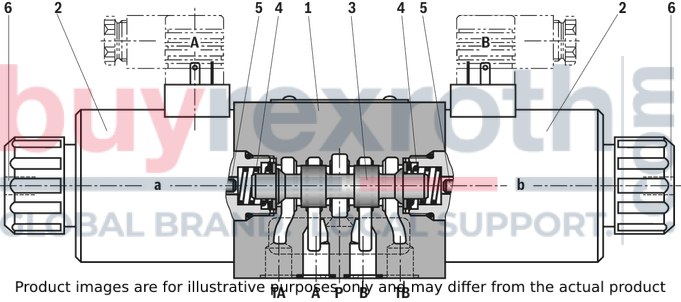 The directional valve basically consists of housing (1), one or two electronic solenoids (2), control spool (3), and the return springs (4). When de-energized, the control spool (3) is held in the central position or in the initial position by the return springs (4) (except for version "O"). The control spool (3) is actuated by wet-pin electronic solenoids (2).