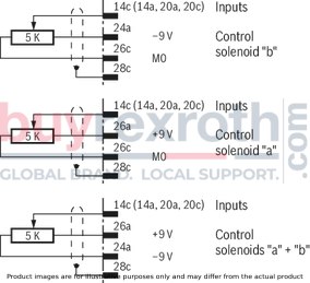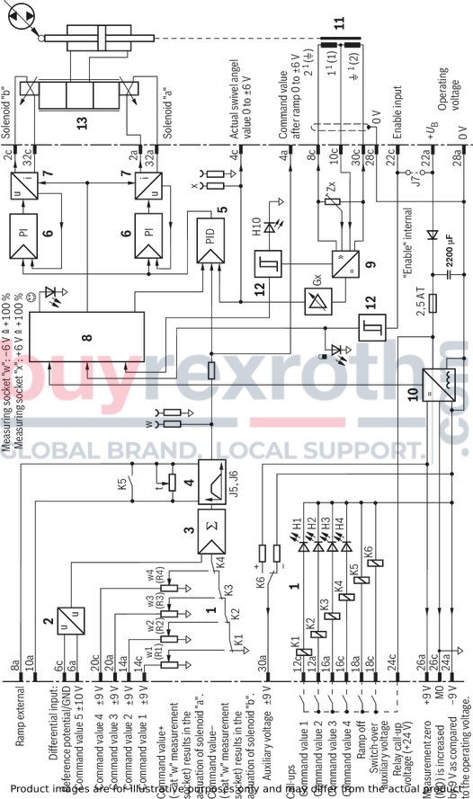 The PID controller has been especially optimized for the specified pump types. The current output stages are controlled depending on the difference between swivel angle command value and actual swivel angle value. A positive command value signal at the amplifier input actuates the output stage for solenoid "a", a negative command value signal the output stage for solenoid "b".