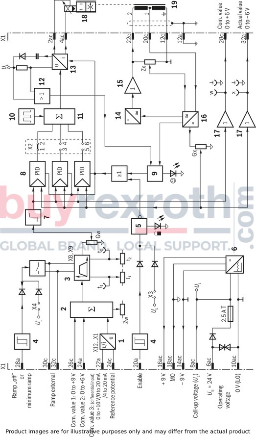 (e.g. at excessive command value voltage or by adjustment of the potentiometer for zero point "Zw" and basic value "Gw") to prevent the valve spool from hitting the mechanical end positions. The output signal of the limiter [7] is the position command value which is supplied to the PID controllers [8] and via an output stage [17] also to measuring socket "w" on the front plate of the card as well as to port 28c at the connector strip X1 (command value after ramp and limiter). A voltage of +6 V at command value measuring socket "w" corresponds to a command value of +100 %. The PID controllers are especially optimized for the respective valves. Prior to assembly of the card, jumpers X2 have to be set to the position dedicated for the valve types to be controlled (also refer to the sticker on the rear of the PCB. In the controllers, the position command value and the actual position value are compared; in case of a difference, a corresponding control output is returned. In the downstream summing device [11], a rectangular voltage generated by the dither generator [10] is added to the control output and the resulting signal forwarded to the current output stage [13] the output signal of which controls the proportional solenoid of the throttle valve.