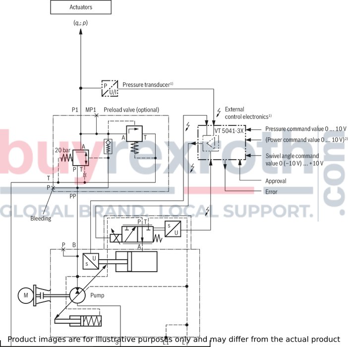 The control system consists of the following components: Axial piston variable displacement pump A10VSO.../31 VT-DFP-.2X proportional valve as pilot valve including inductive position transducer for valve position sensing. External control electronics VT 5041-3X for realizing all electric functions necessary for the SYDFE1-2X (separate order) Position transducer for sensing the swivel angle Pressure transducer with suitable signal level and dynamics (optionally HM 20, otherwise separate order) Preload valve with integrated pressure relief function SYDZ (optional)